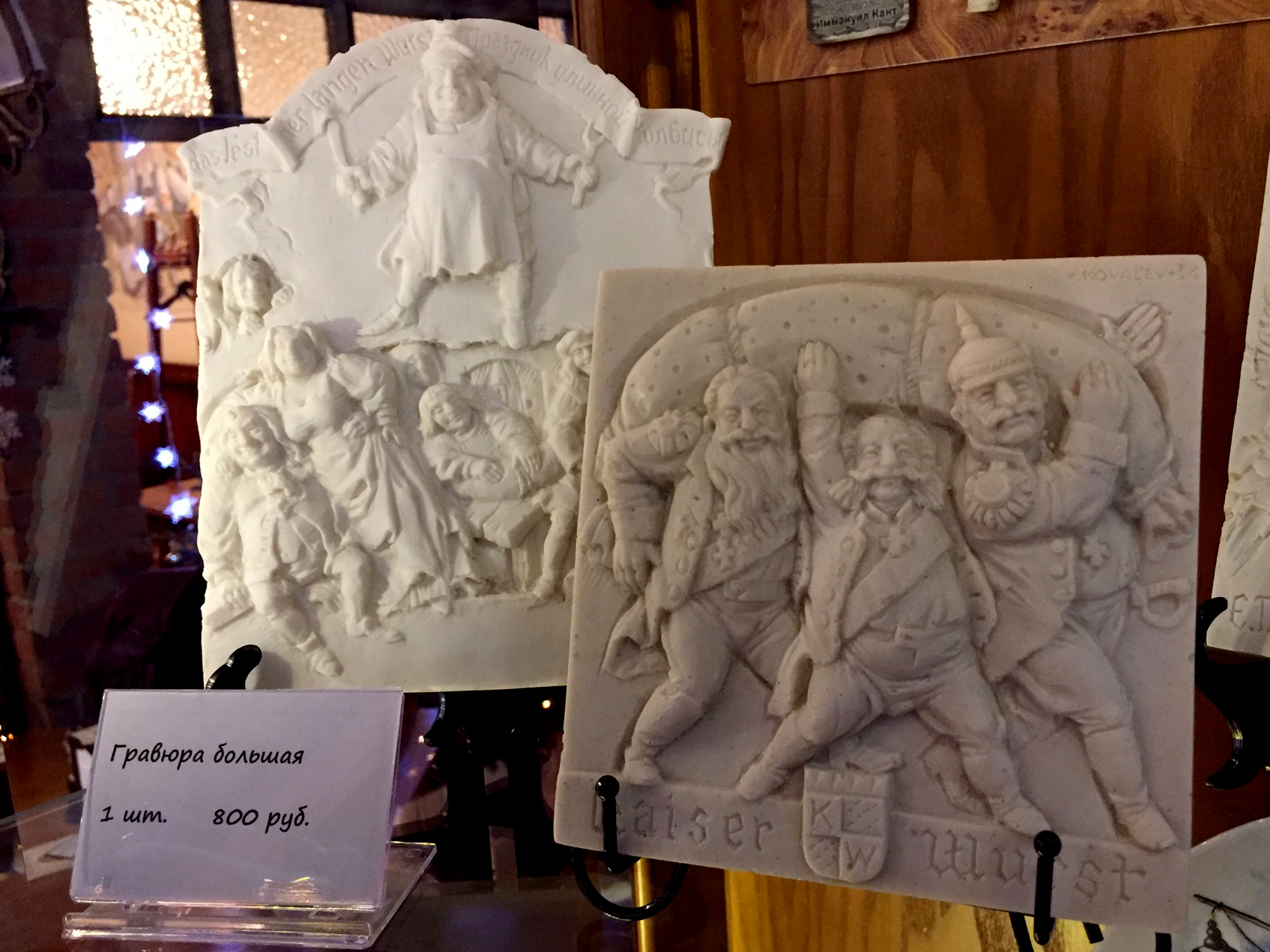 Дорогие друзья, в нашей сувенирной лавке Вы можете купить изделия местных художников и ремесленников. Пивные кружки ручной работы, расписные тарелки, гравюры и магниты в кёнигсбергской тематике будут напоминать Вам о приятном времени, проведённом в нашем ресторане. В качестве сувенира можно приобрести бутылочку знаменитого прусского ликера или баварского пива.
