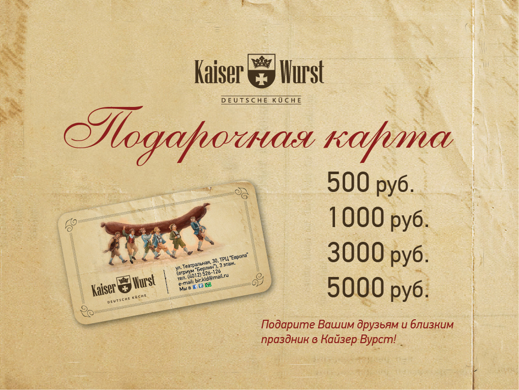 Прекрасный подарок вашим друзьям и близким. Подарочные карты Kaiser wurst номиналом от 500 рублей.
